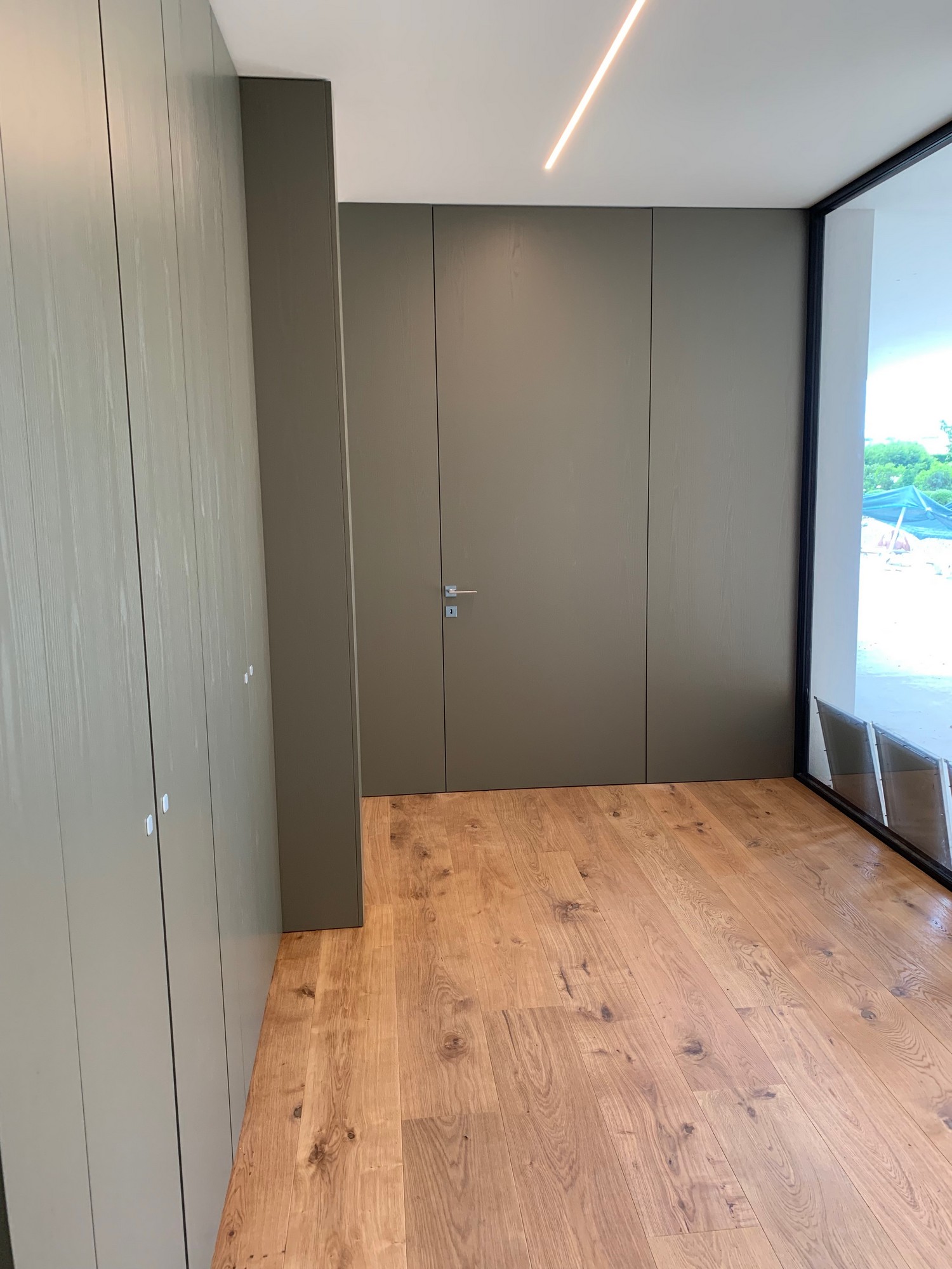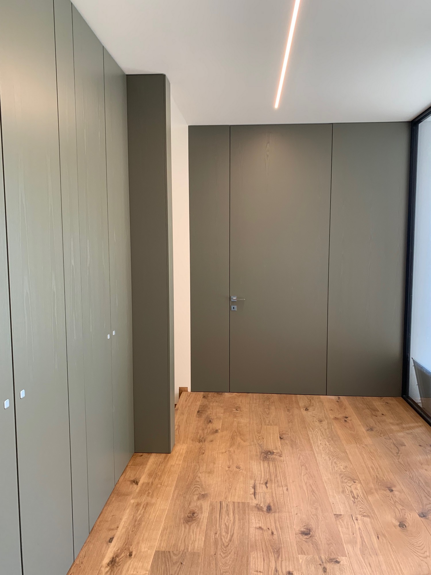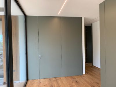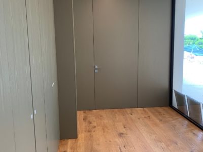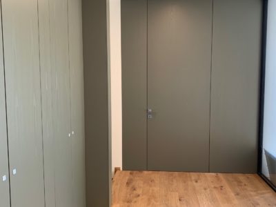Le porte sono realizzate “al soffitto” con delle boiserie della stessa finitura muschio che creano un effetto di continuità di grande impatto estetico.