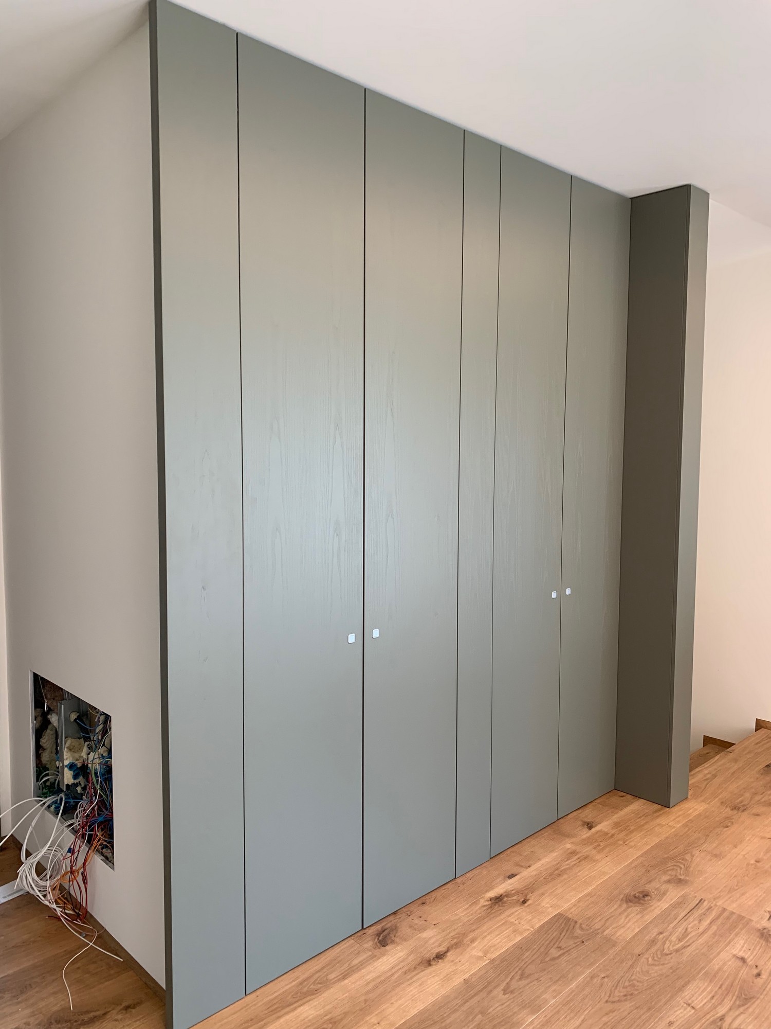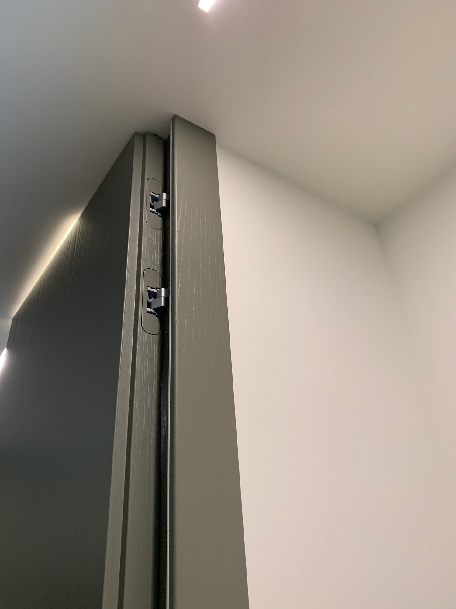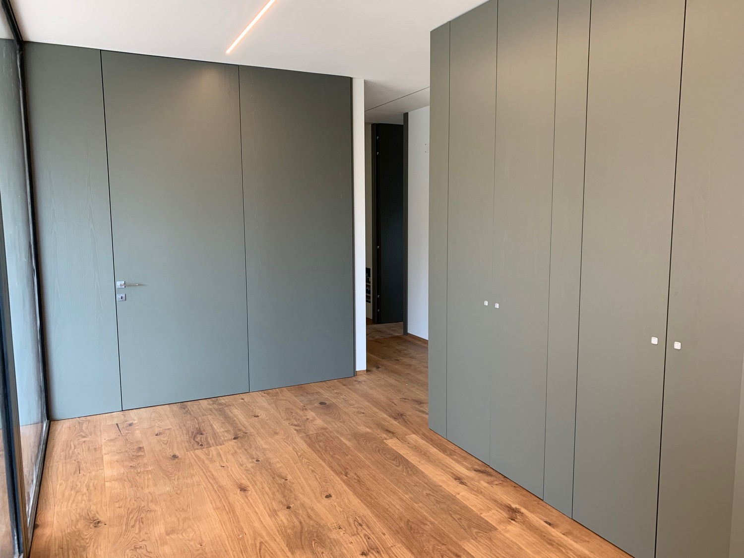 Le porte sono realizzate “al soffitto” con delle boiserie della stessa finitura muschio che creano un effetto di continuità di grande impatto estetico.