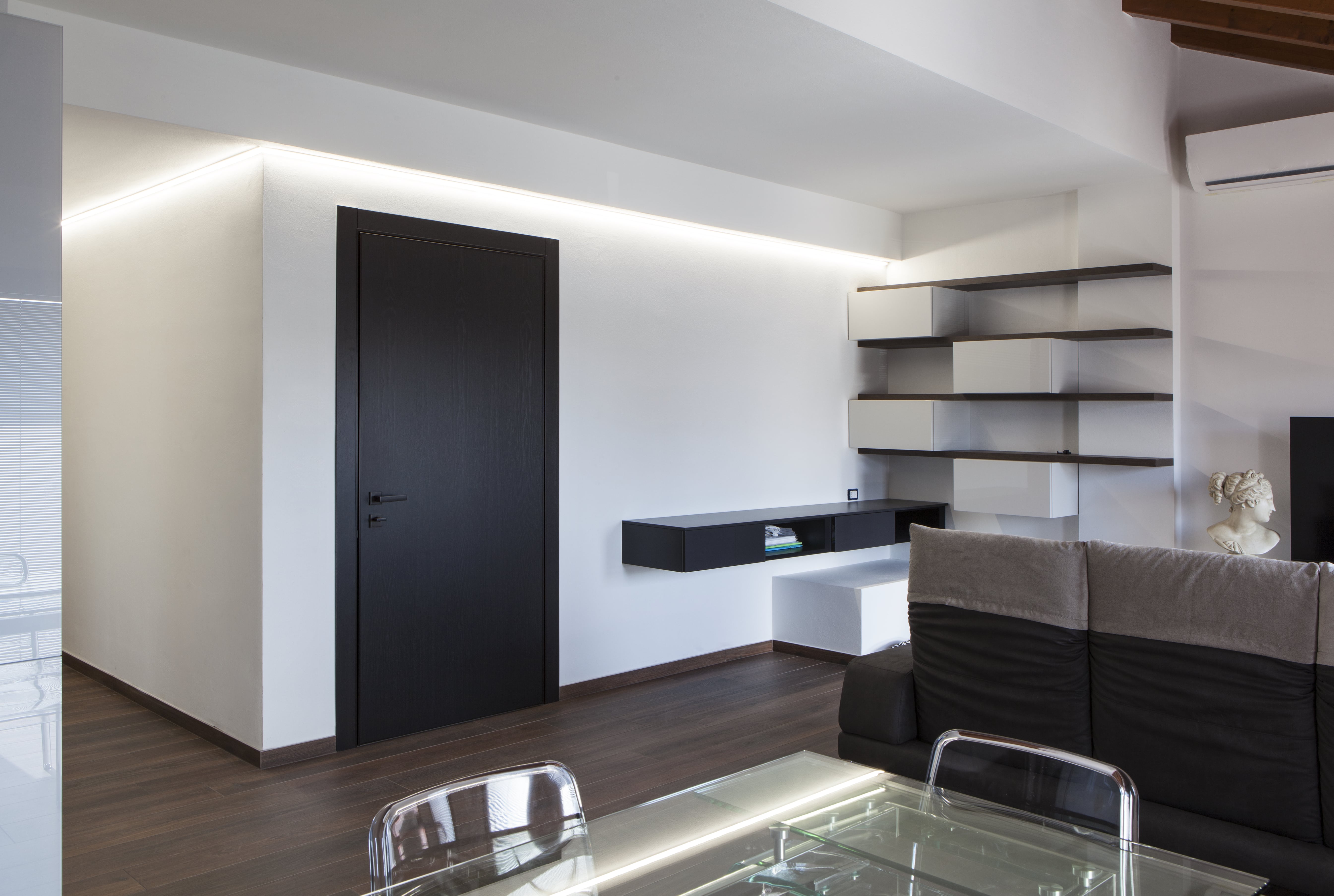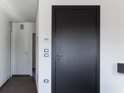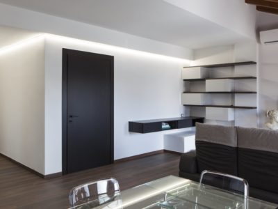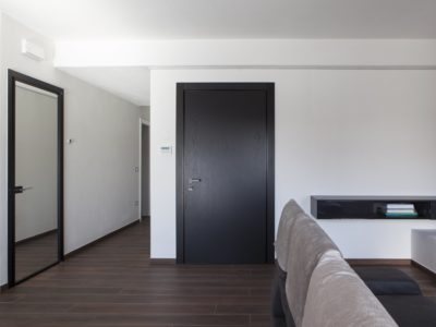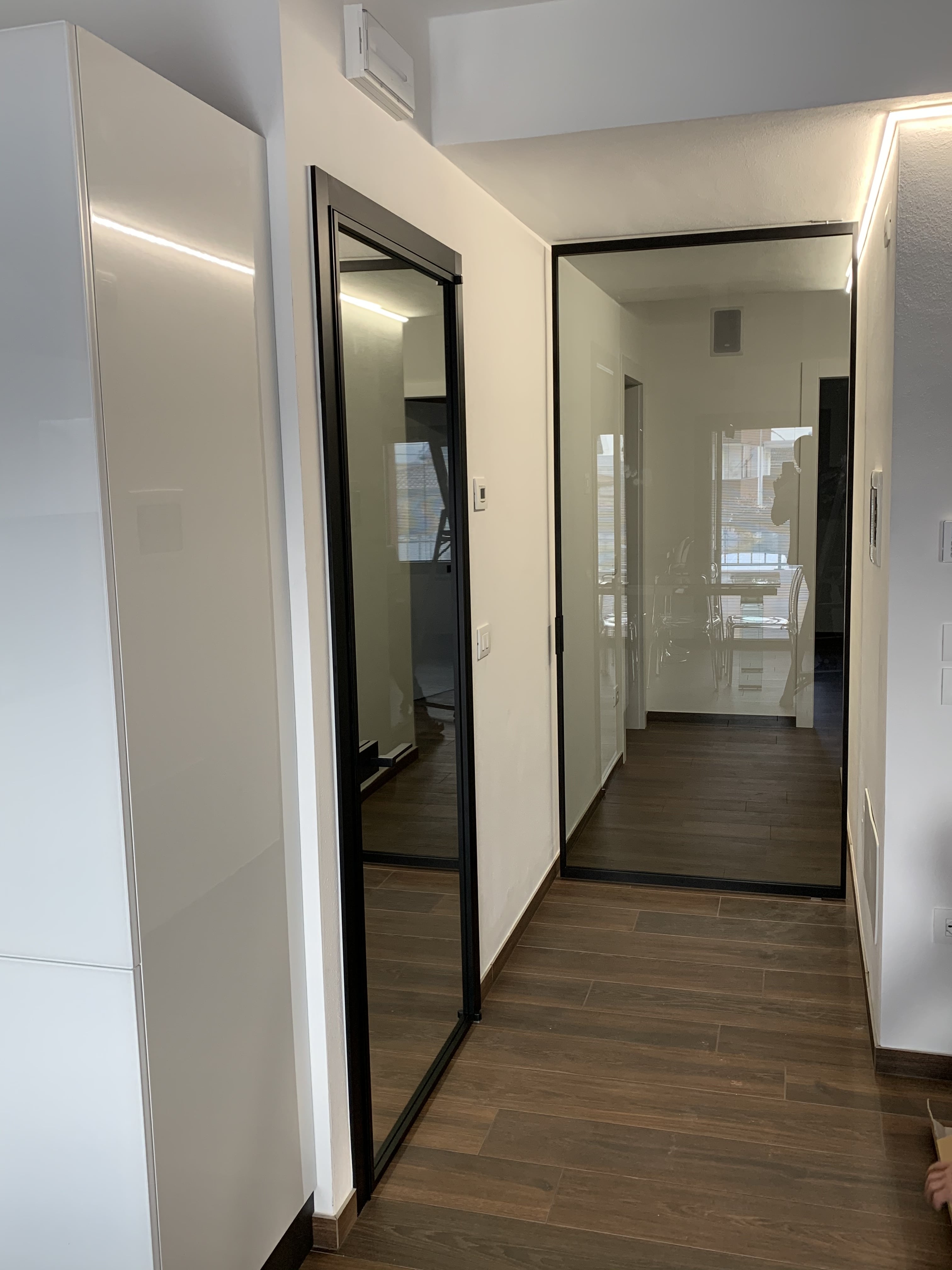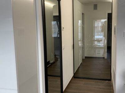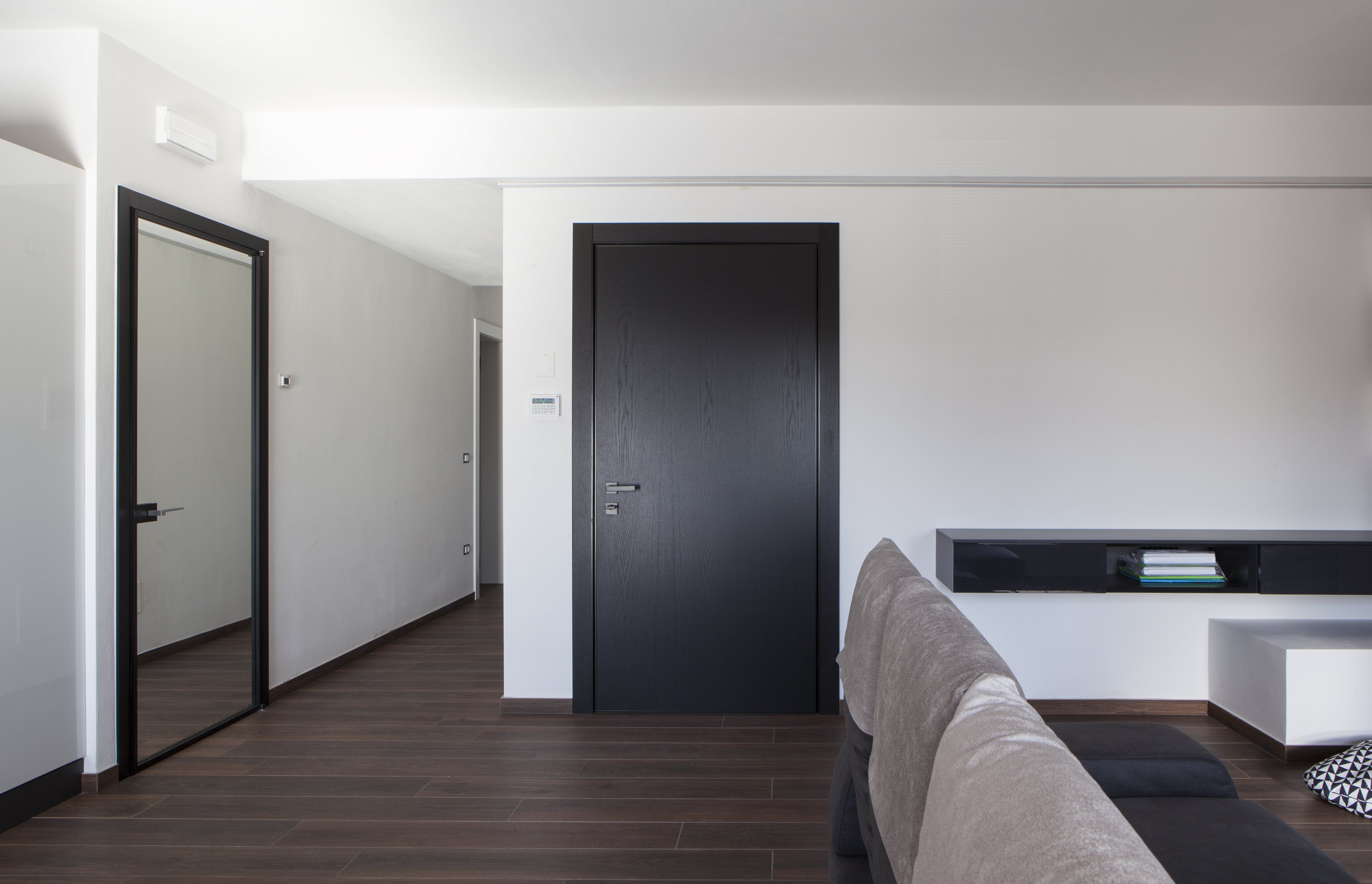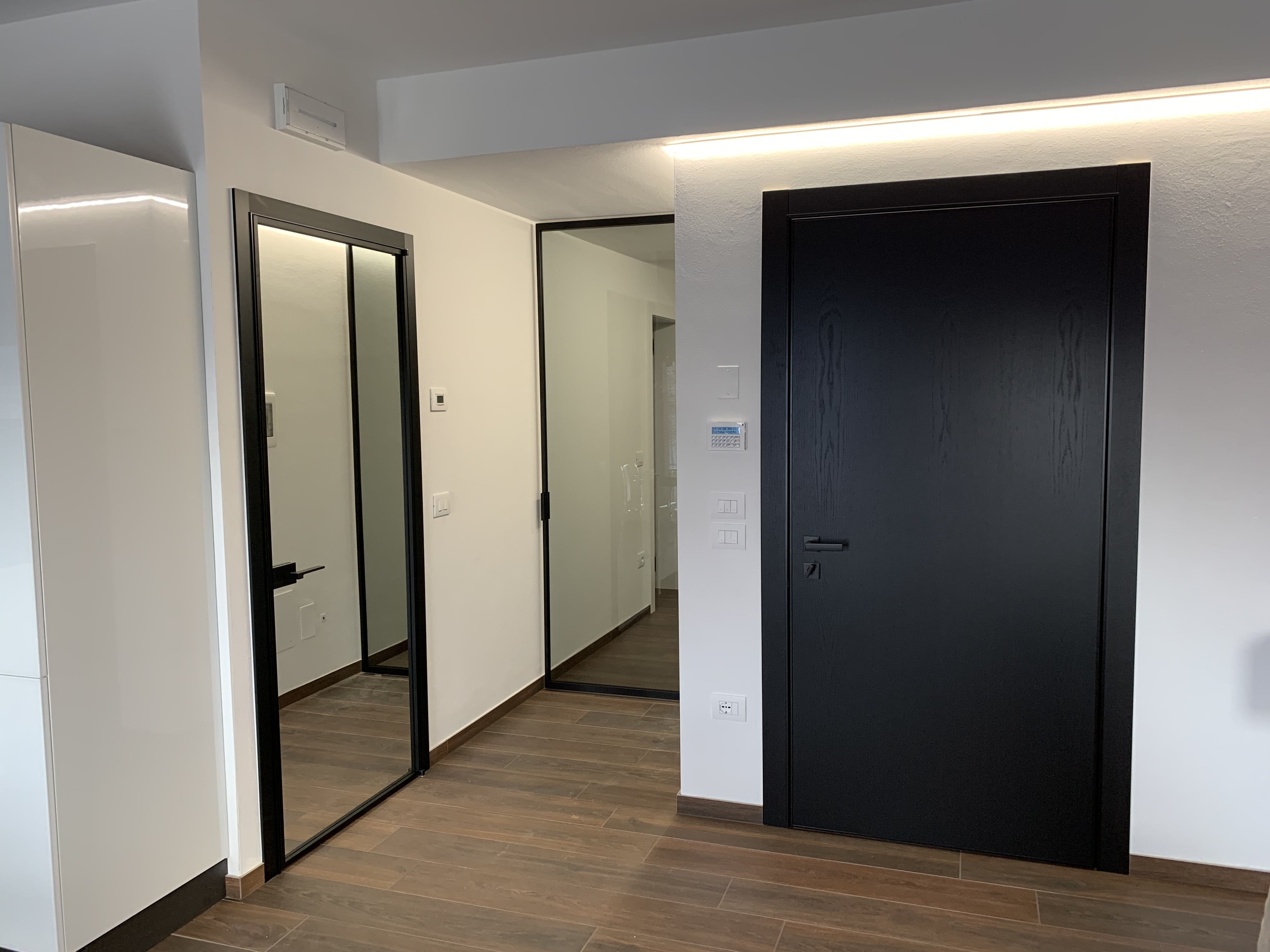 Per le porte interne che danno sul corridoio dell’appartamento – visibili dall’ingresso – abbiamo fornito una soluzione coordinata: sono state quindi installate una porta in vetro alluminio a bilico decentrato verniciata in nero e una porta battente a specchio.