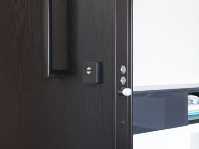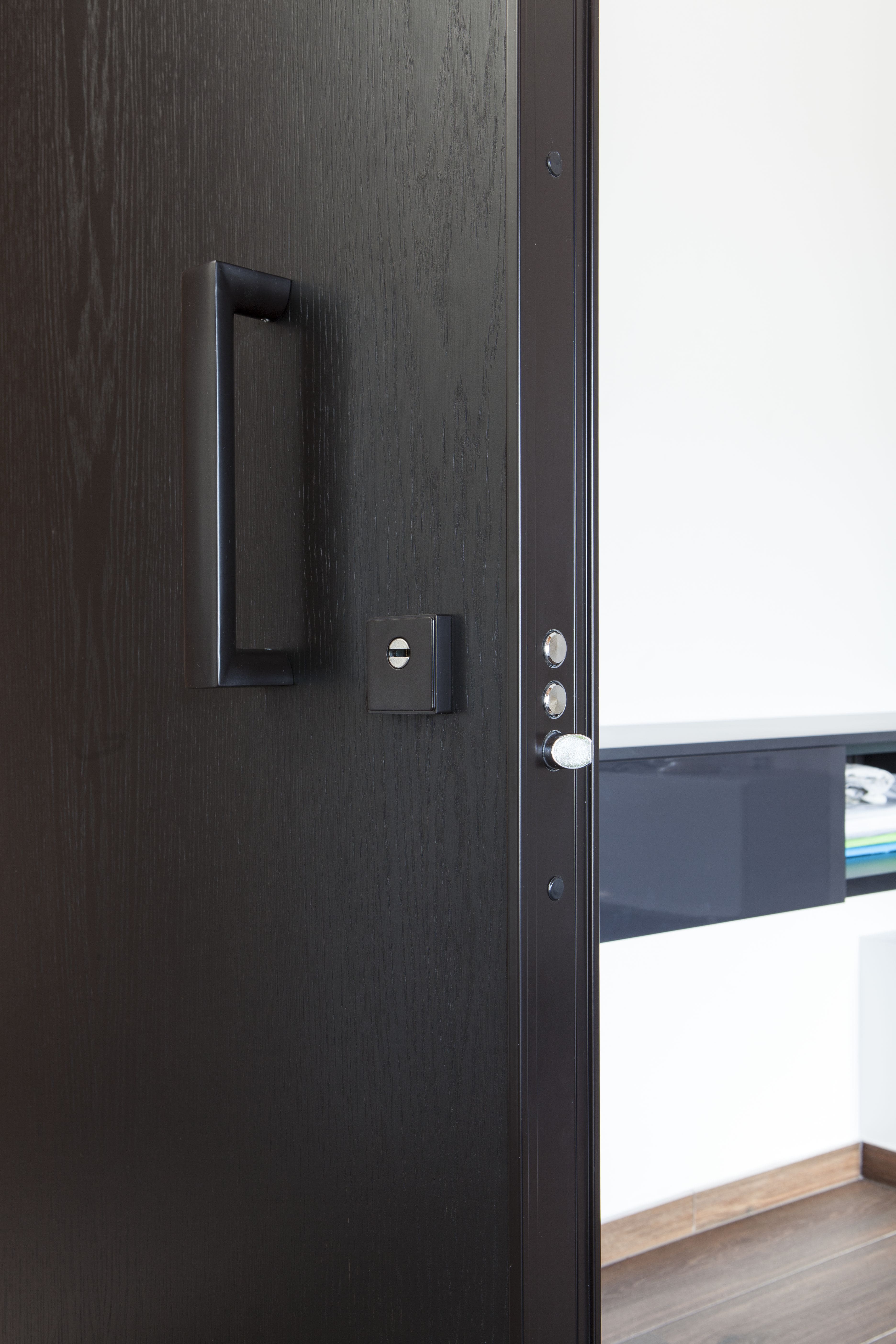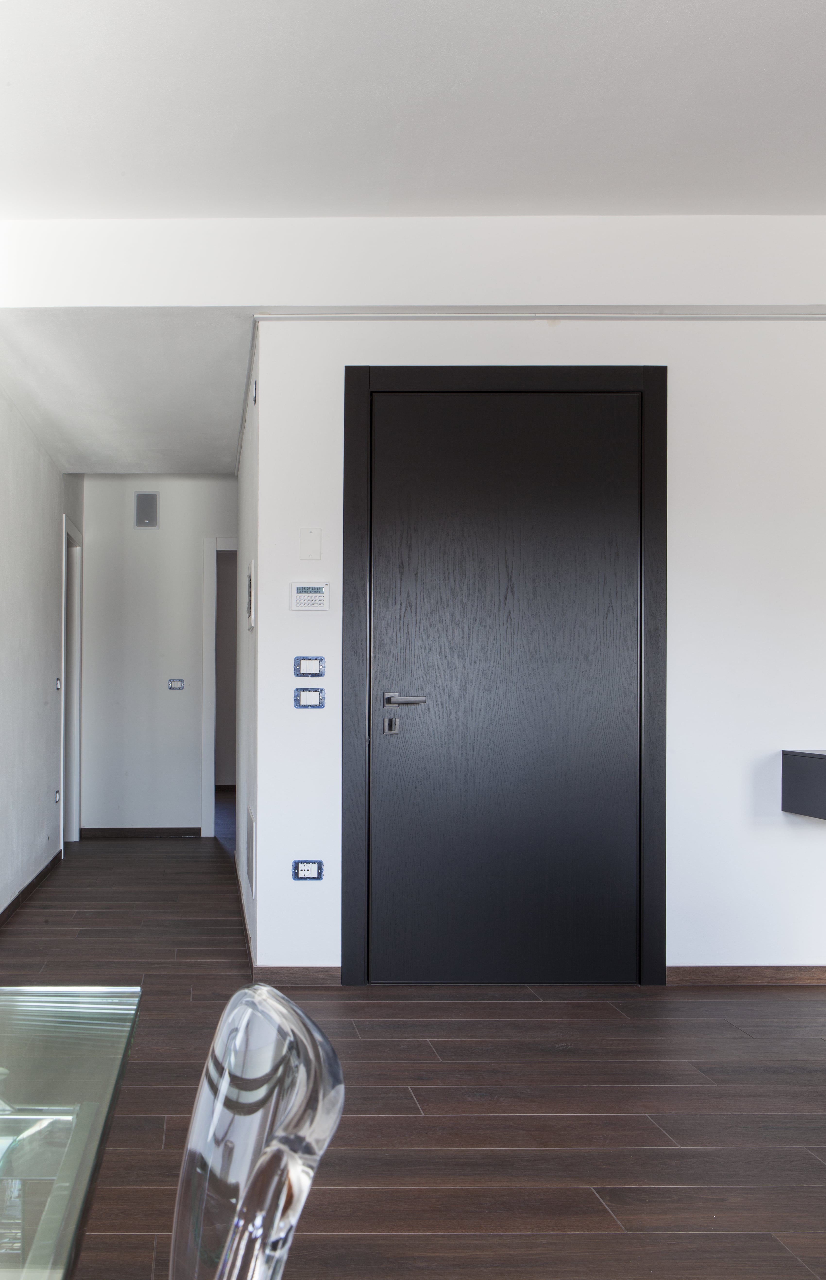 Dato che la porta d’ingresso dell’appartamento affaccia direttamente sulla zona giorno, abbiamo optato per una soluzione minimal che simulasse l’effetto estetico di una porta interna: la scelta è caduta sul modello Project di Oikos. La porta è stata installata nella versione rasomuro, con cerniera a scomparsa, ed è rivestita in legno di rovere (finitura wenge) con maniglia e maniglione in tinta.