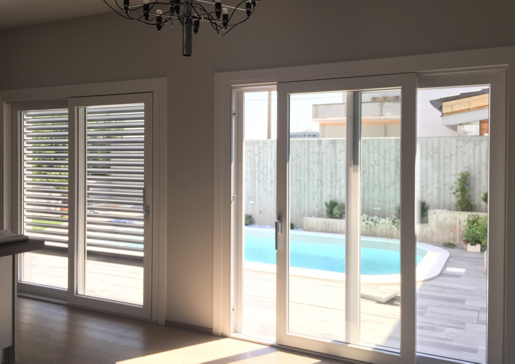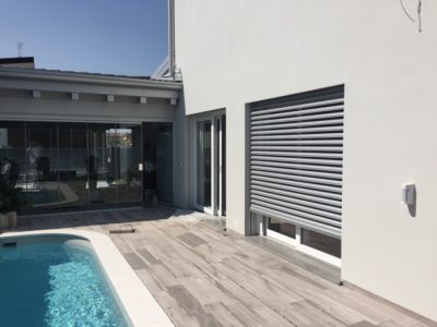 La scelta dei prodotti è stata dettata dalla ricerca della qualità e delle performance e dall'ascolto delle esigenze specifiche del cliente. Le vetrate più grandi della villetta sono infatti esposte a sud-ovest e per questo abbiamo proposto un frangisole orientabile al piano terra; al primo piano sono stati invece montati degli scuri in materiale composito con cerniera a scomparsa.