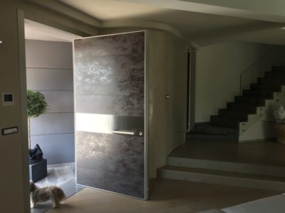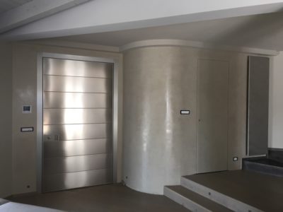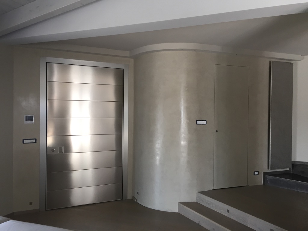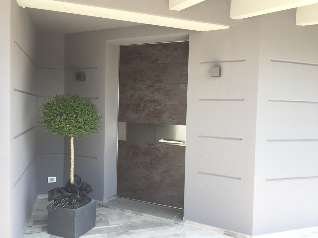 Per quanto riguarda il portone d'ingresso, Synua di Oikos, è stato scelto con un raffinato rivestimento esterno in gres effetto corten e interno in acciaio. Di fianco all'ingresso è stata poi posata una porta rasomuro che il cliente ha tinteggiato come la parete, per creare un guardaroba praticamente a scomparsa.
