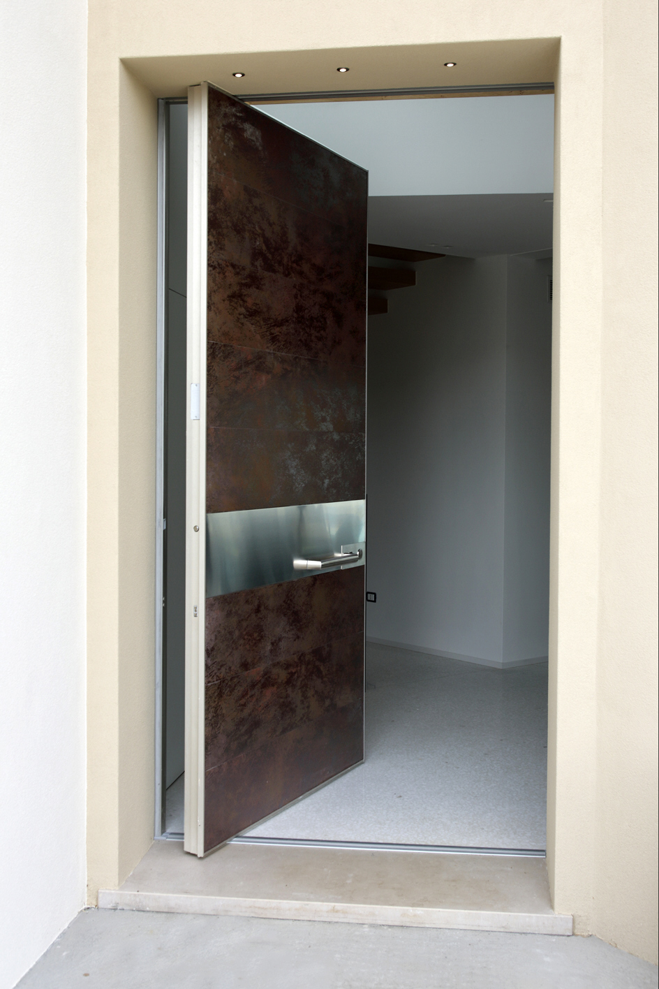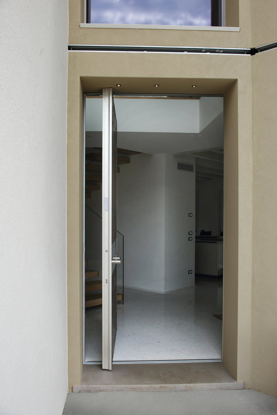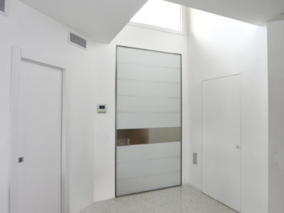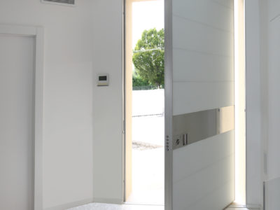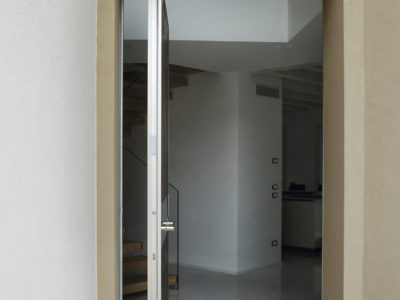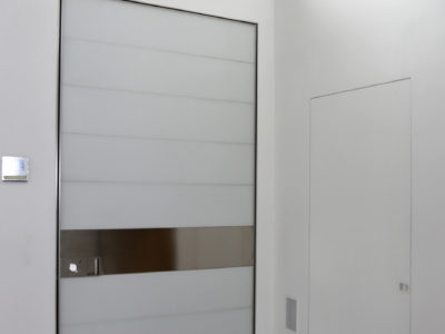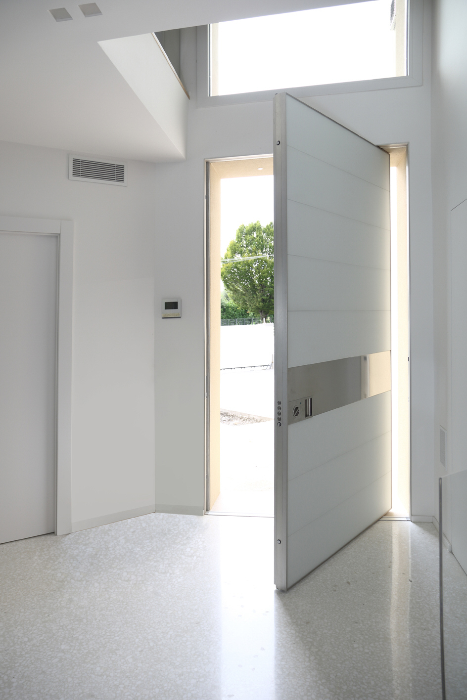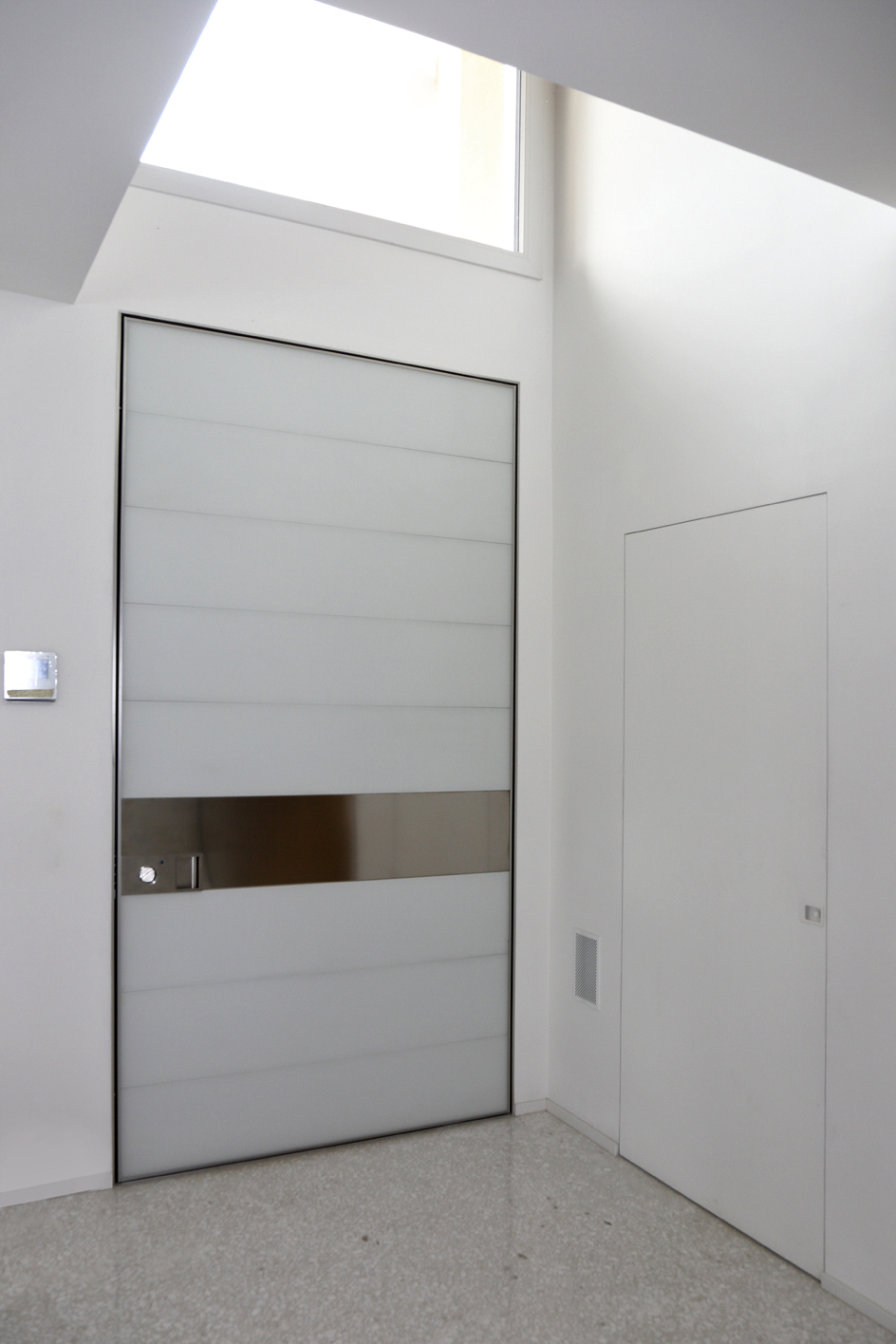 L'esigenza del cliente era quella di avere un ingresso ad anta unica da 150x270 cm per dare continuità all infisso ad unica specchiatura posizionato sopra . problema risolto con SYNUA di Oikos. Porta a bilico con effetto rasomuro interno con maniglia complanare e in questo caso fornita con serratura elettronica ed apertura con impronta digitale.