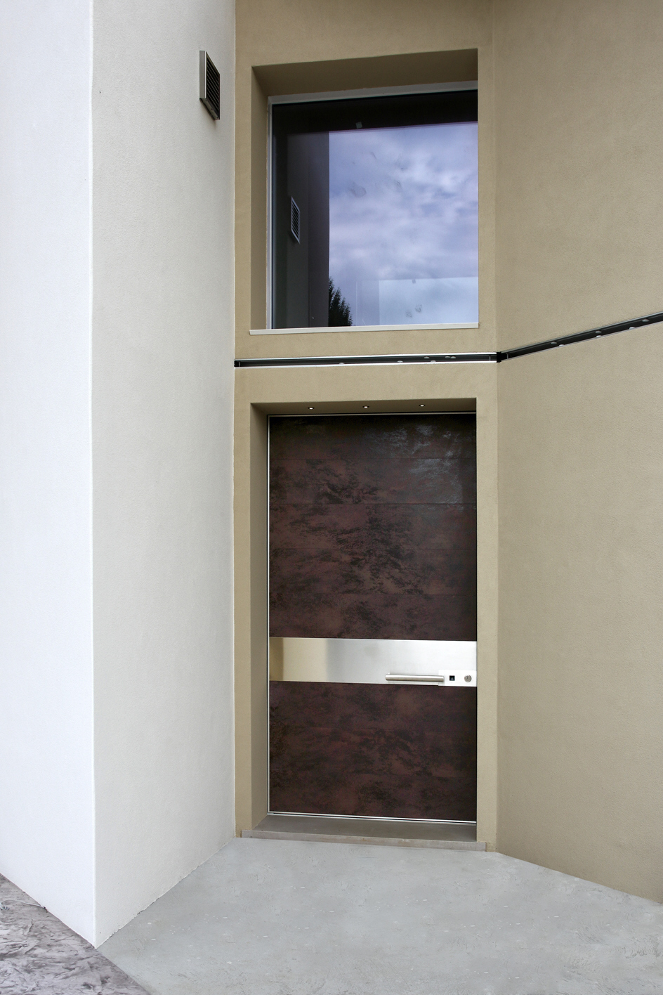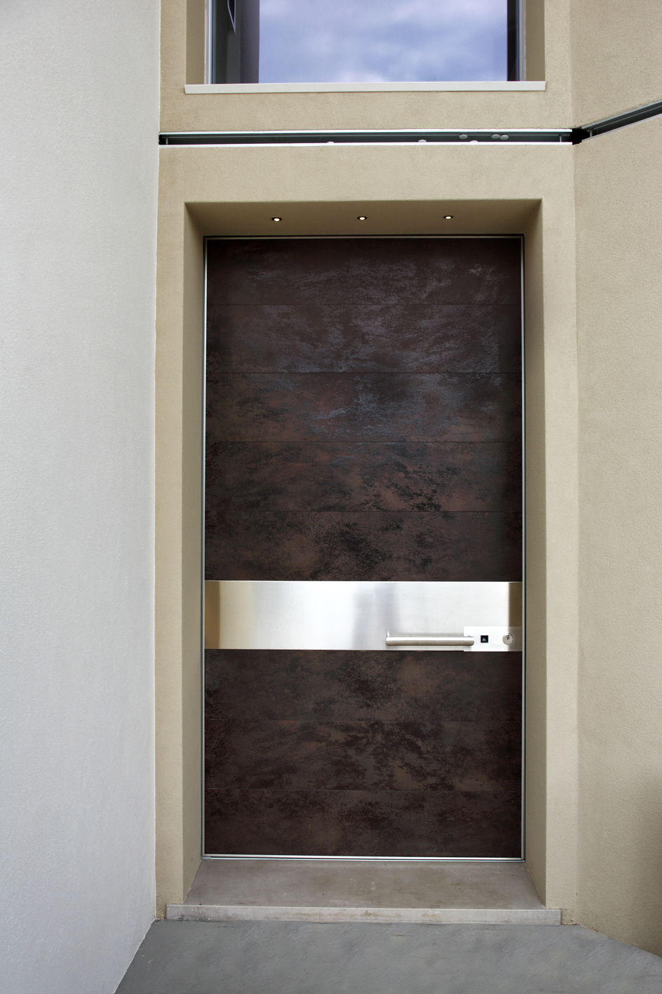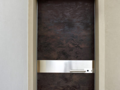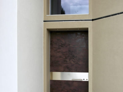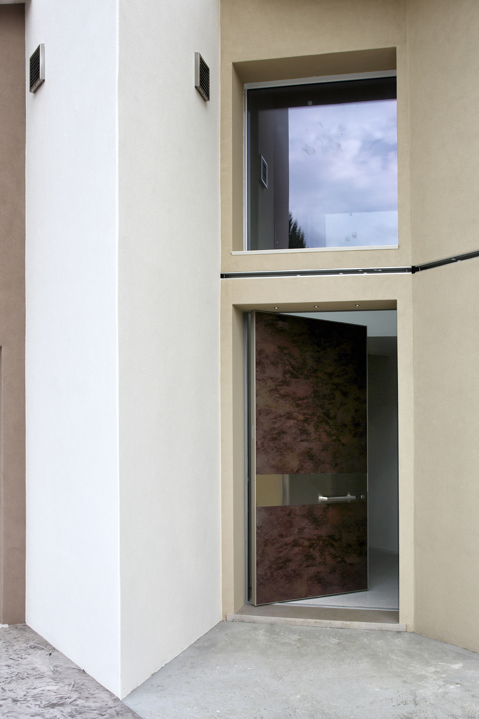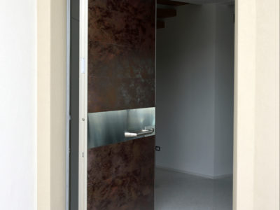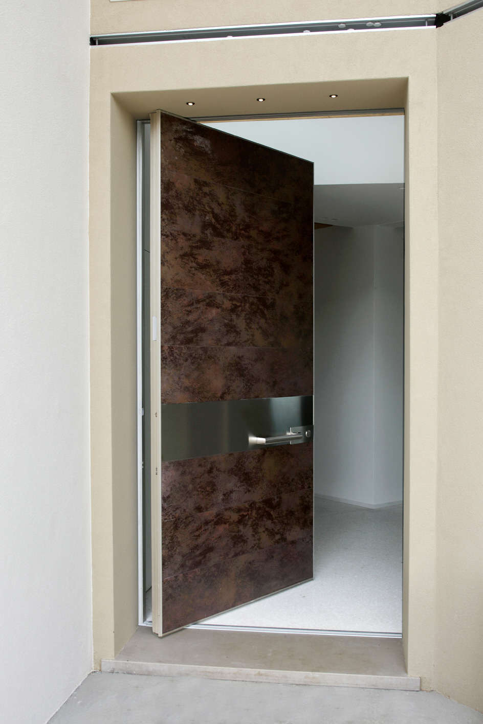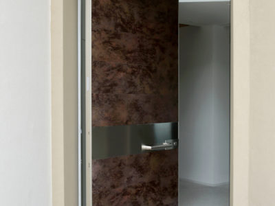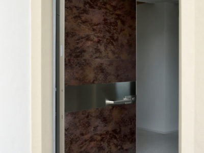 L'esigenza del cliente era quella di avere un ingresso ad anta unica da 150x270 cm per dare continuità all infisso ad unica specchiatura posizionato sopra . problema risolto con SYNUA di Oikos. Porta a bilico con effetto rasomuro interno con maniglia complanare e in questo caso fornita con serratura elettronica ed apertura con impronta digitale.
