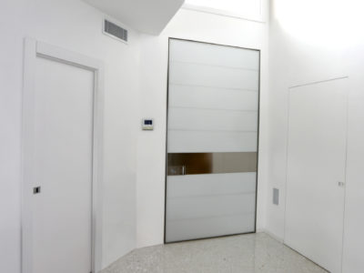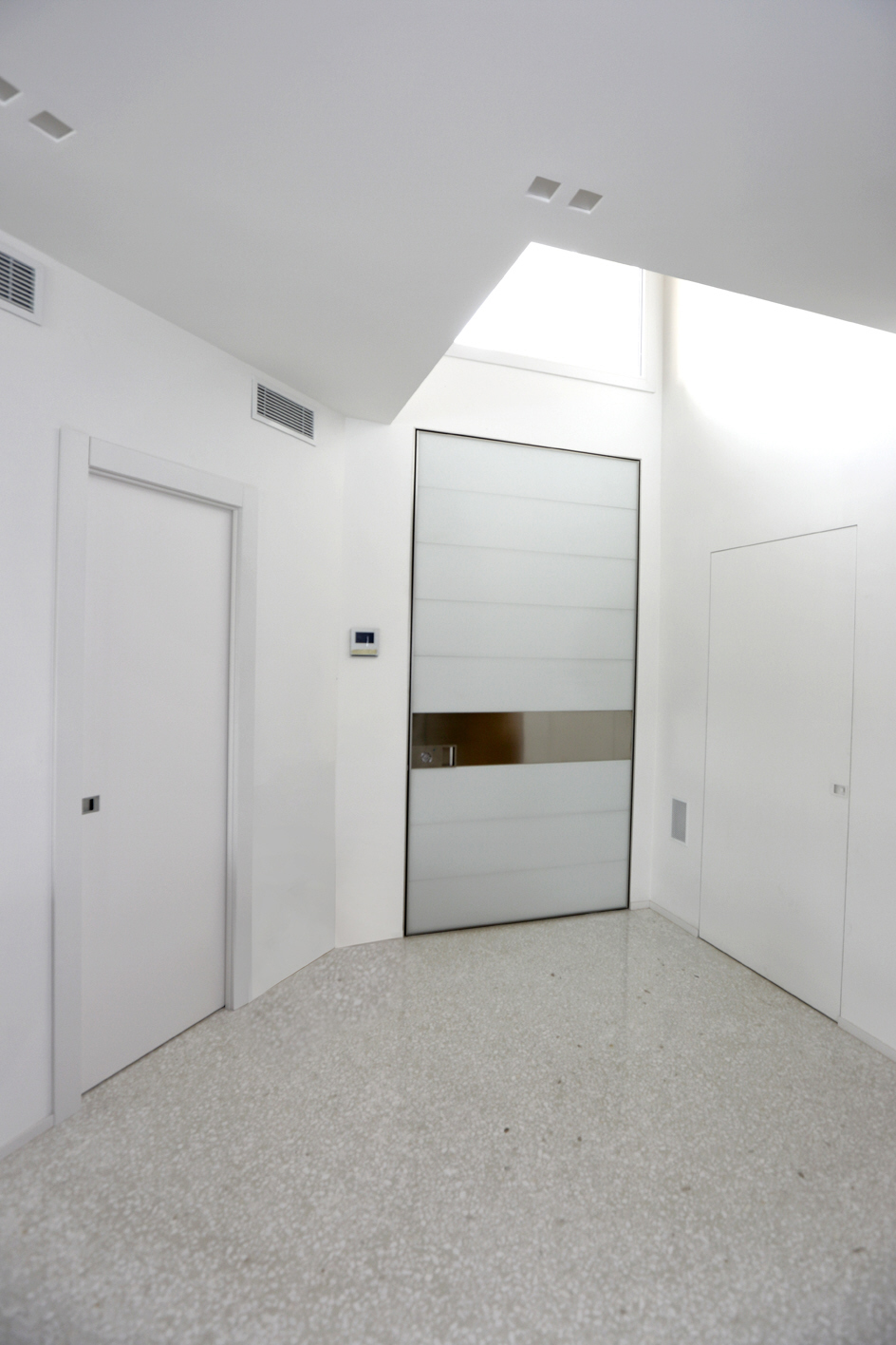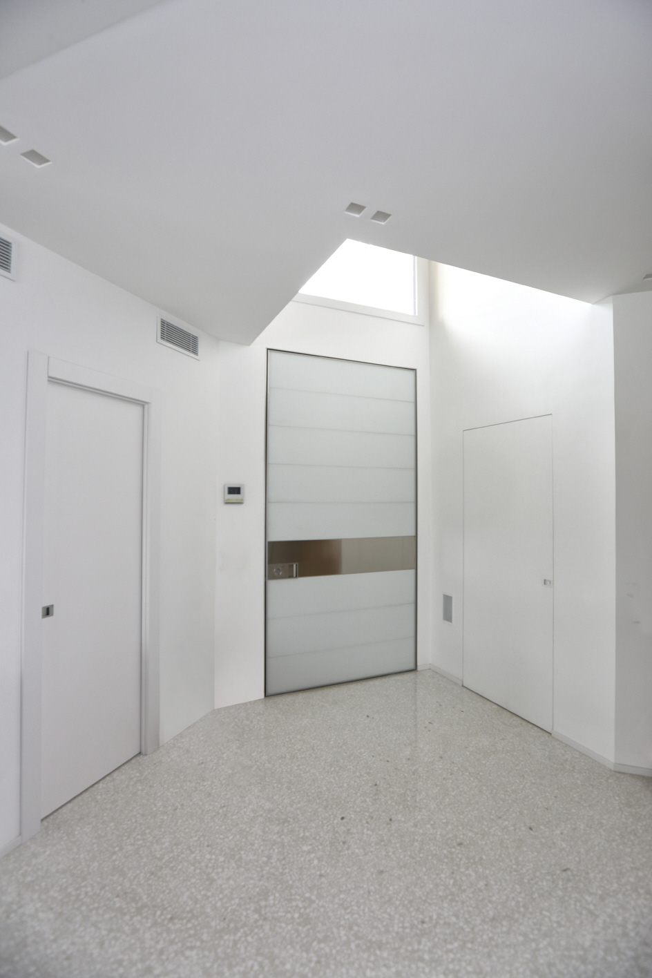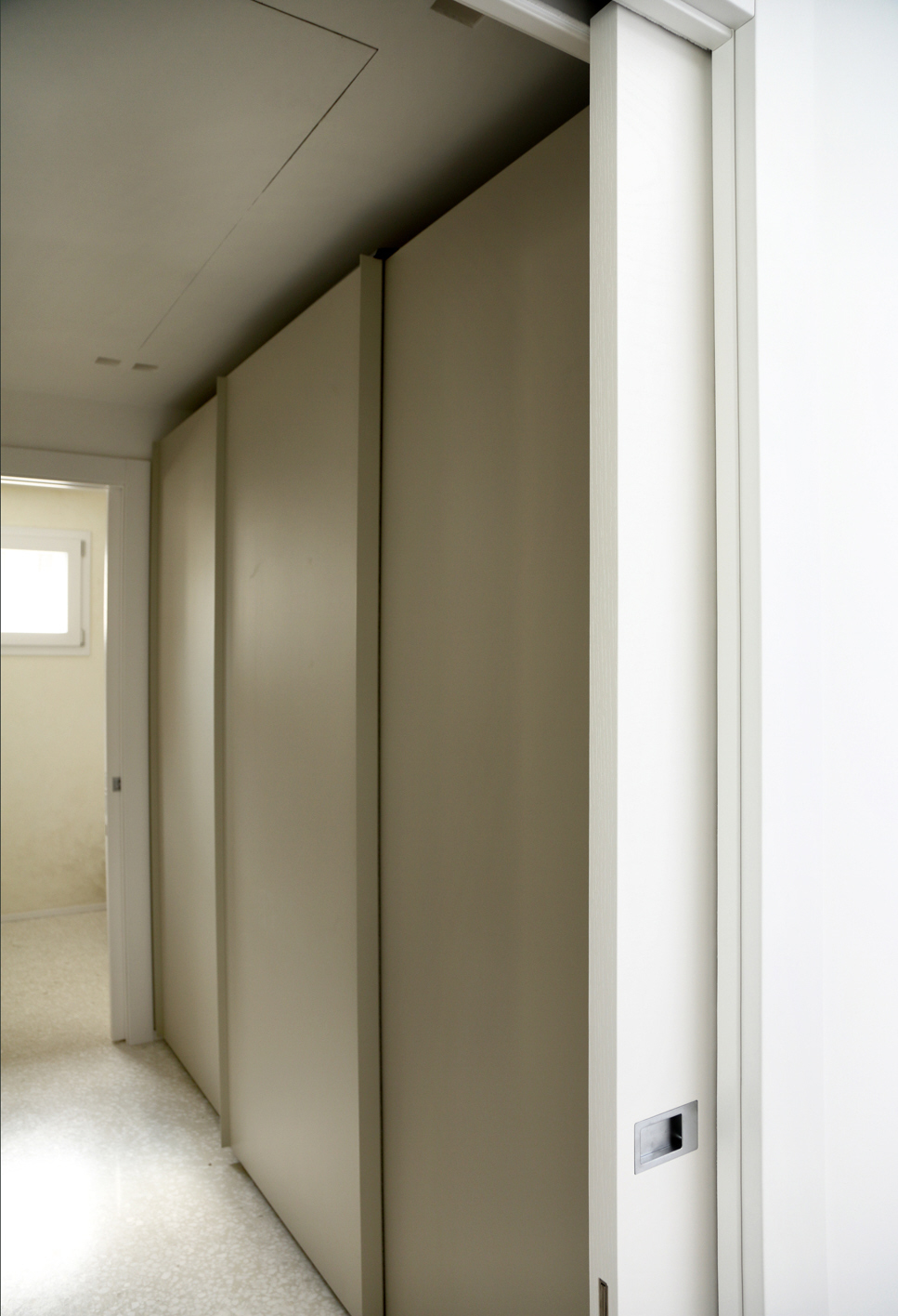 Ci siamo poi concentrati nella zona ingresso dove abbiamo consigliato una porta rasomuro a scomparsa nella parete con una speciale maniglia a filo pannello molto minimale