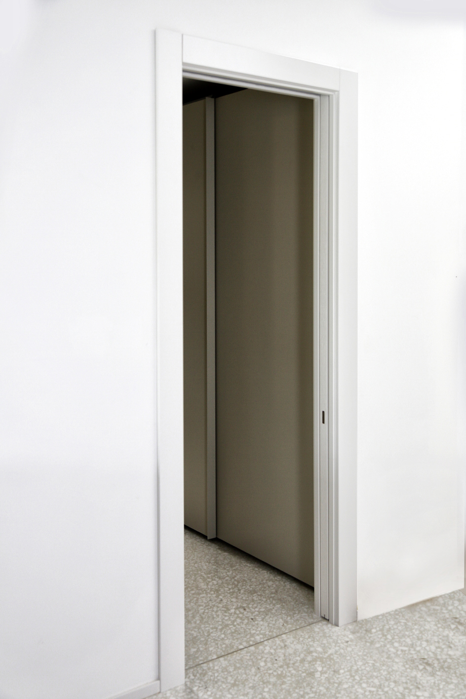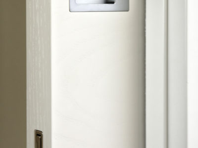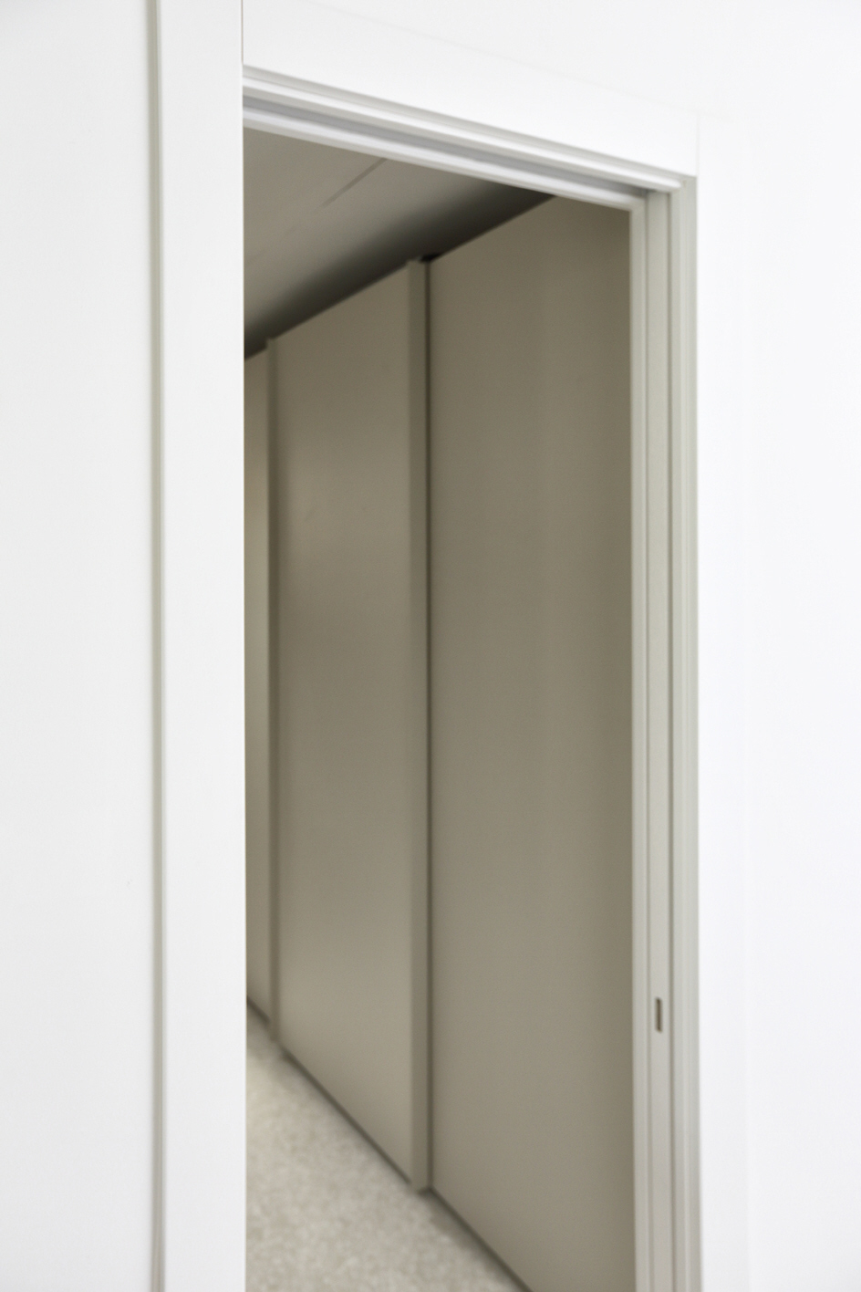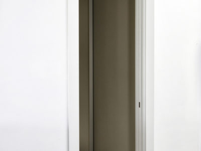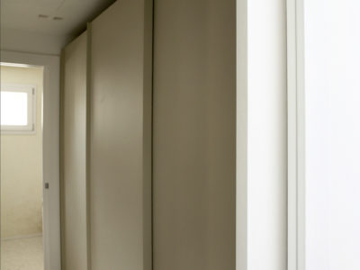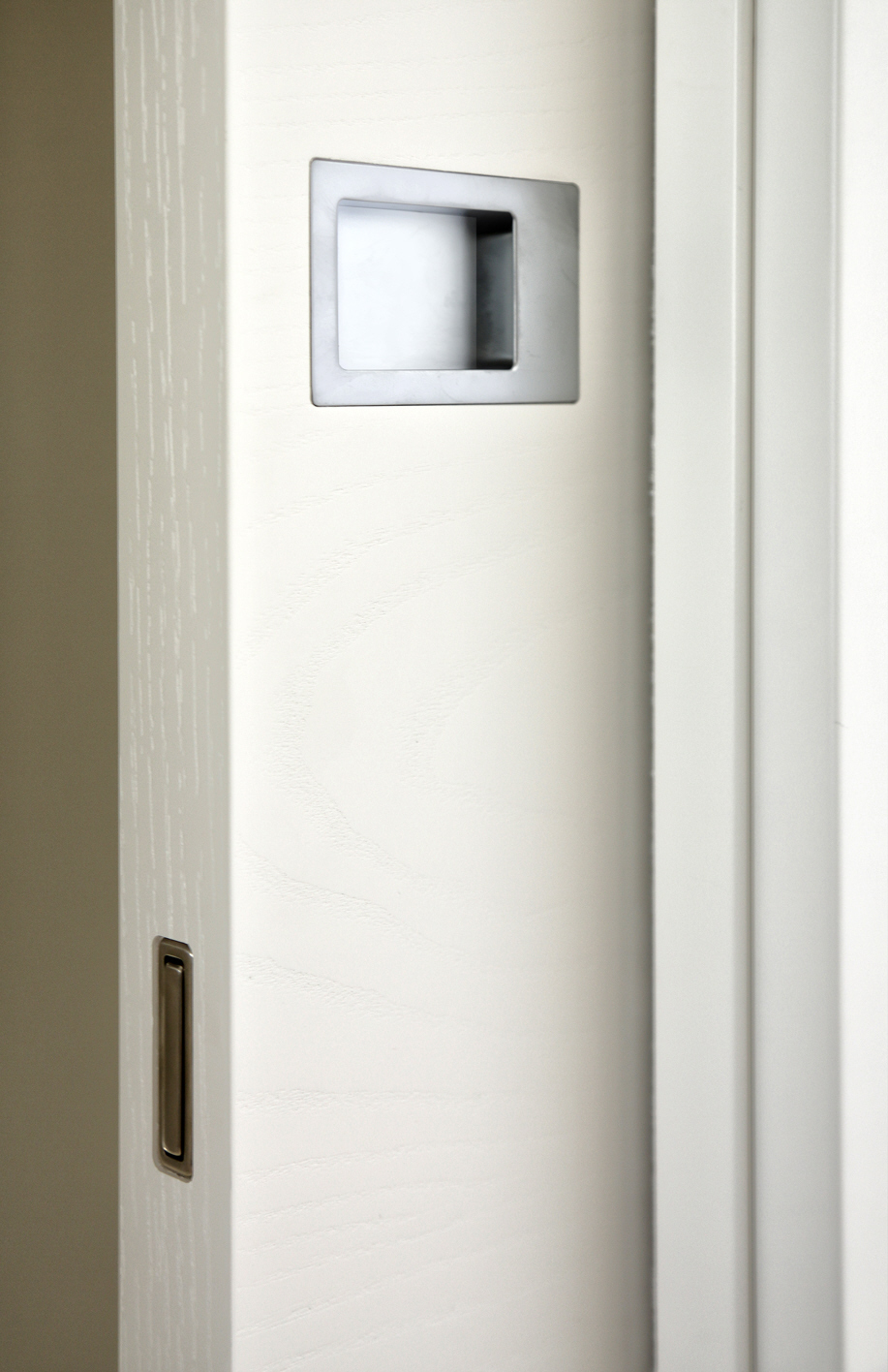 Ci siamo poi concentrati nella zona ingresso dove abbiamo consigliato una porta rasomuro a scomparsa nella parete con una speciale maniglia a filo pannello molto minimale